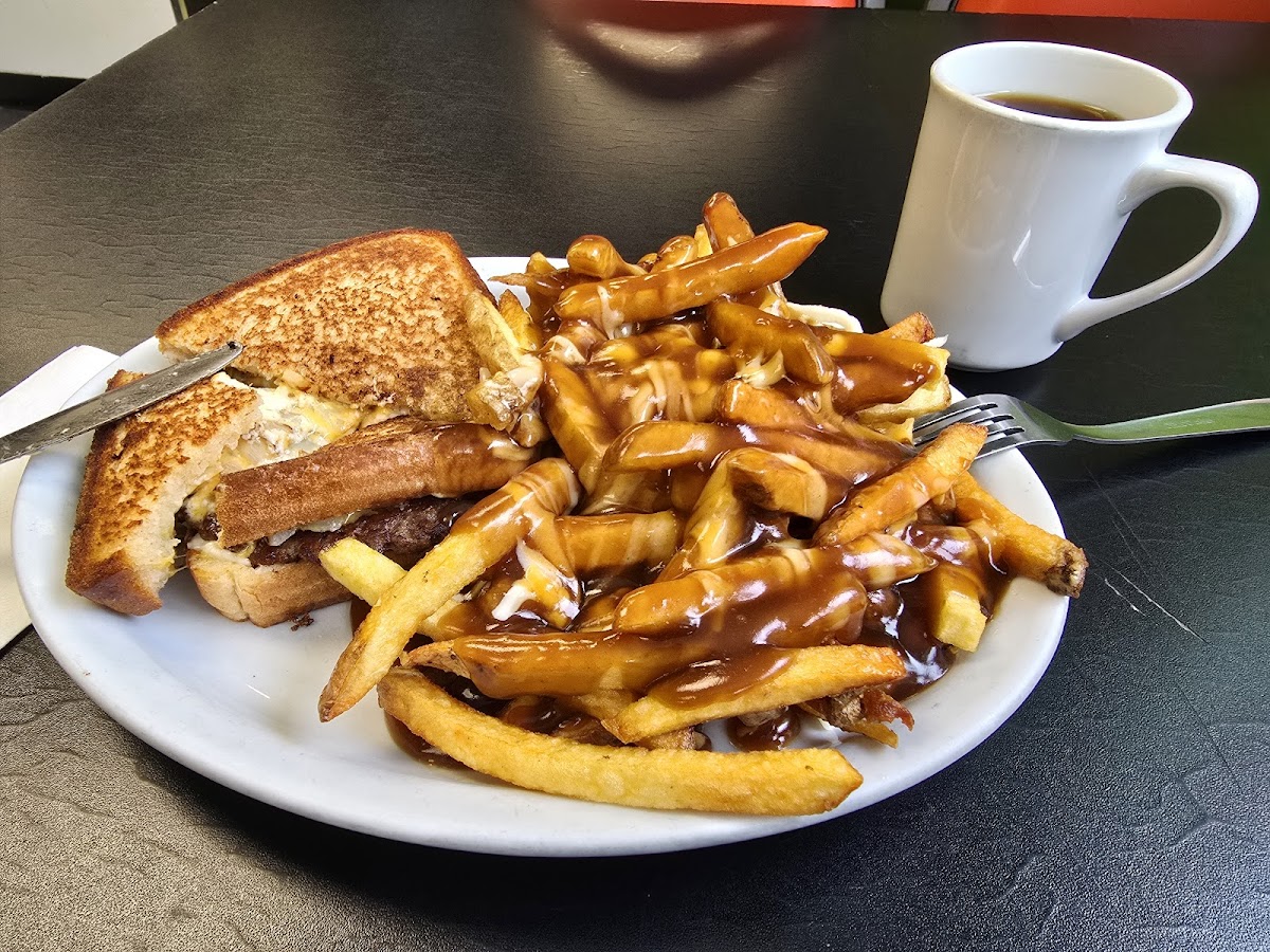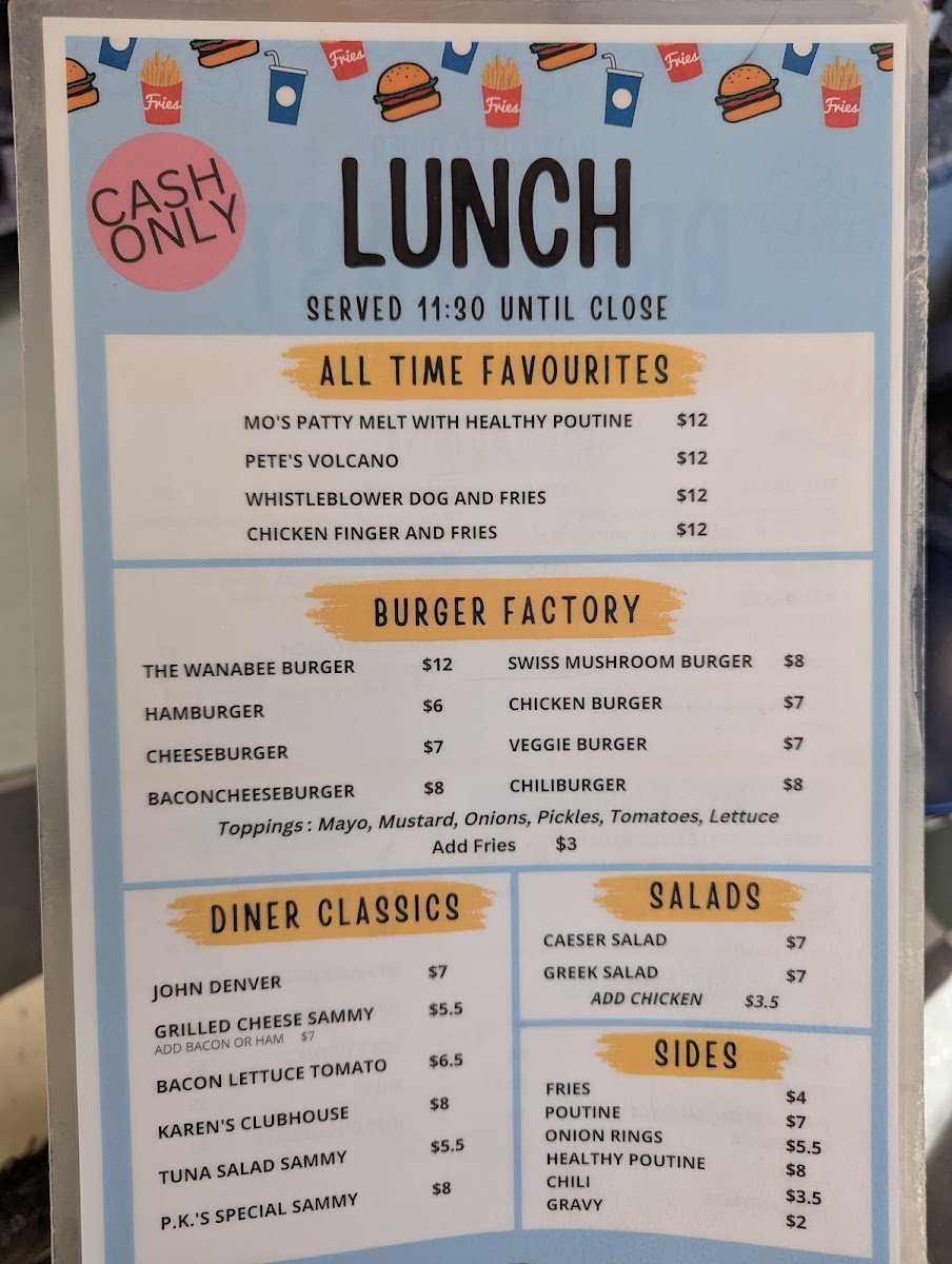 Went here for the first time on a midweek lunch with a friend. They serve lunch menu starting at 1130 and close at 2pm apparently and they are "Closed Mondays Forever". Seems to be owned by a lady who cooks and possibly her husband works the tables. I had the Swiss Mushroom Burger and it was a 1/3 pound patty. So good. It was loaded with everything and it held itself wonderfully. Barely dripped, and the bun supported the contents perfectly. The fries were very good, and the gravy, I'd argue would make excellent poutine gravy. Food was great and didn't feel like I committed the terrible sin of gluttony after eating it. Atmosphere super chill and the staff were personable and very caring. Taking a star off from service because they ONLY TAKE CASH (and etransfer, allegedly?). I hear they've been around for over 15 years which is great, but IT'S 2025 now, COME ON! They had a literal classical cash register! Y'all can do better! P.S. they had adorable (and unique) salt and pepper shakers on each table which was super cool. Would definitely go here again when I have a couple twenties in the wallet.