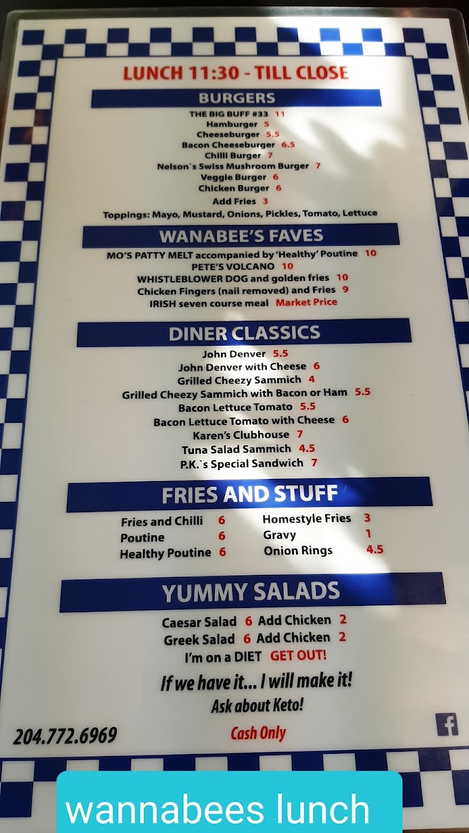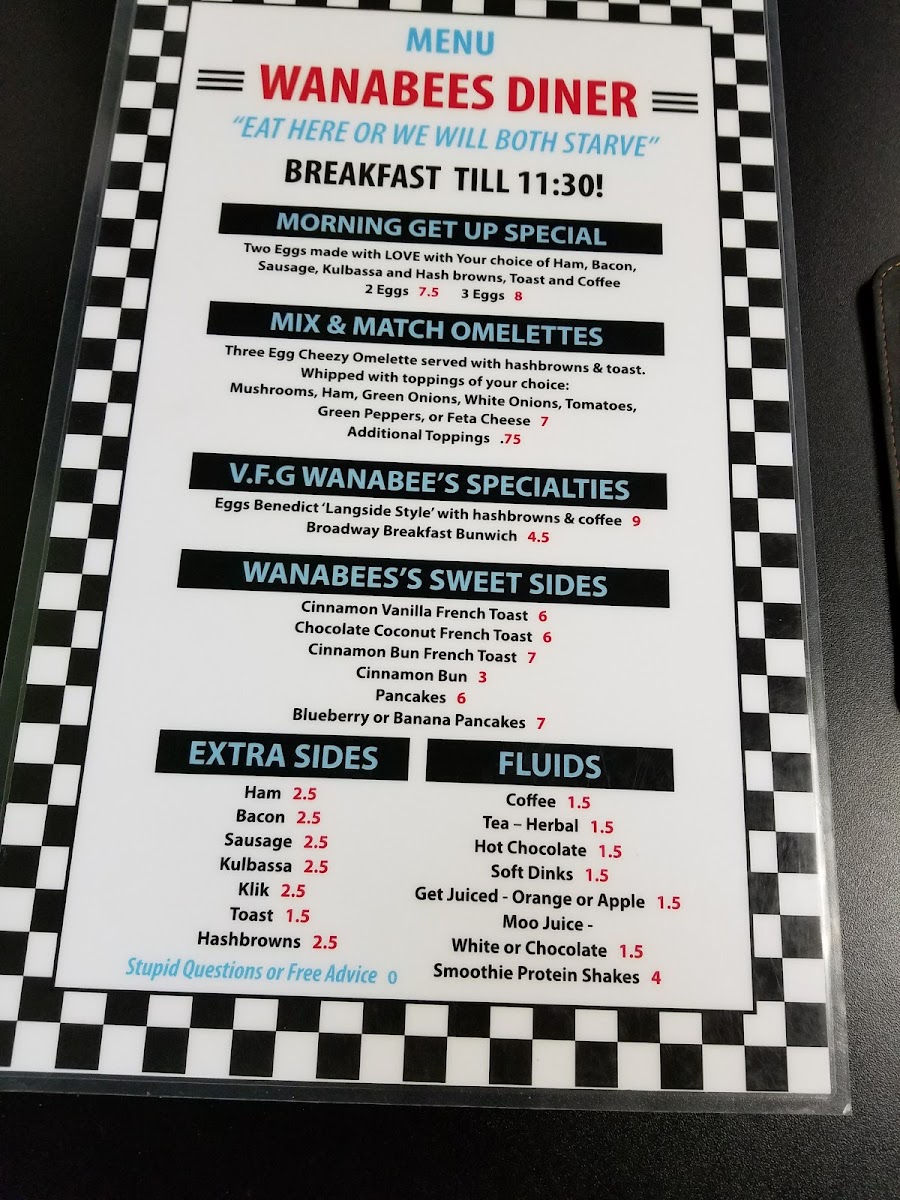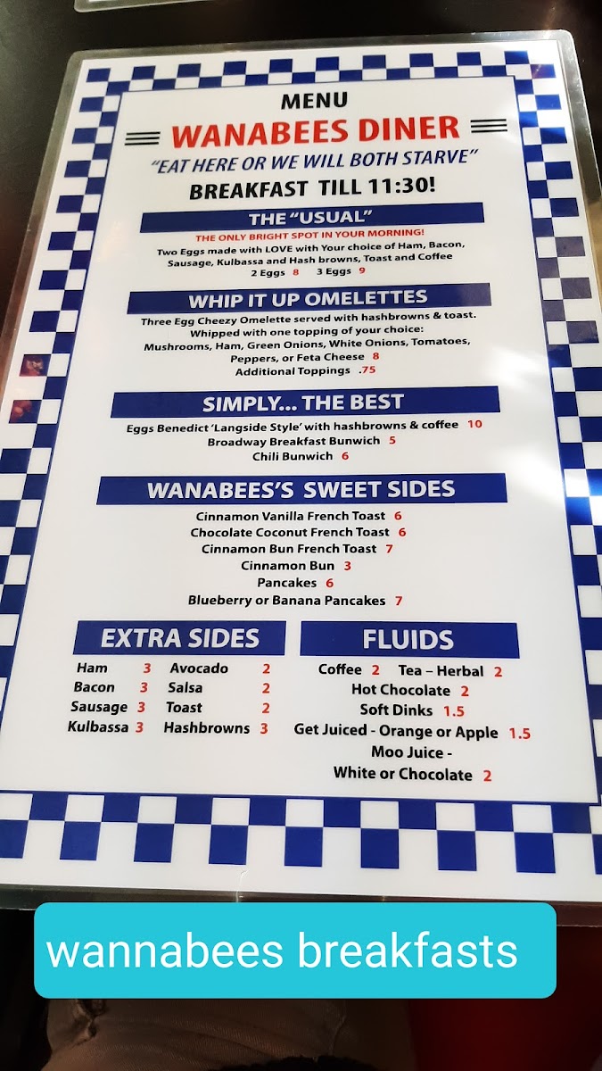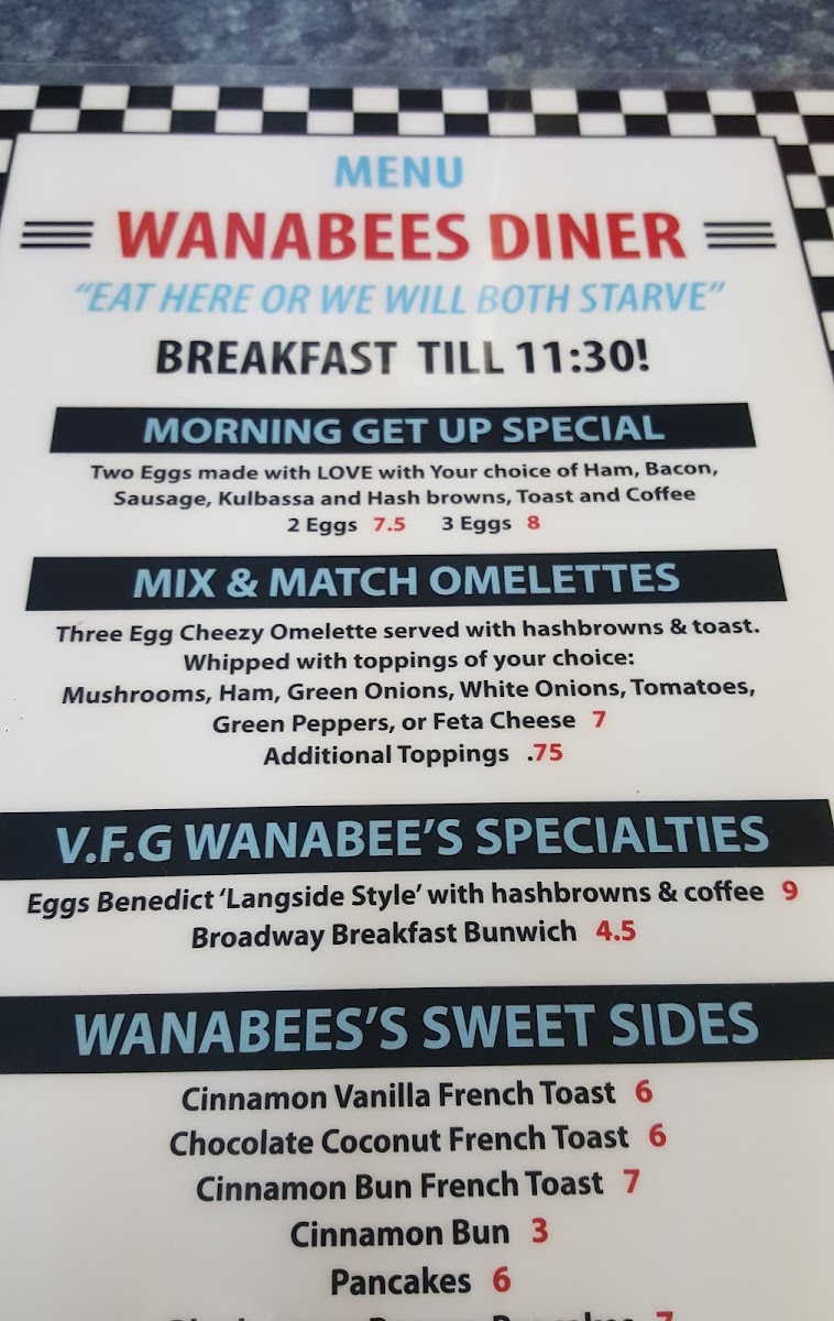 Wanabees Diner Menu